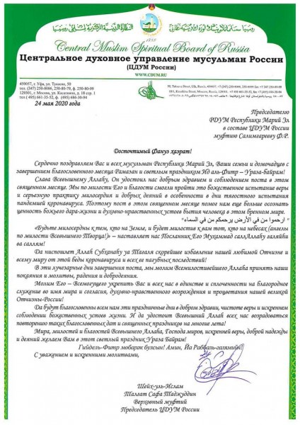 В Соборной мечети г. Йошкар-олы, резиденции РДУМ РМЭ, прошла вторая пятница с ограниченным количеством прихожан. 30 мая вышел указ Главы РМЭ об ограниченном посещении религиозных организаций. До 21 июня 2020 года запрещено посещать мечеть людям: — старше 65 лет; — со слабым здоровьем; — без маски и перчаток.
