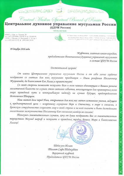 Состоялось торжественное собрание, посвящённое рождению Пророка Мухаммада( мир ему) — Мавлид. Мероприятие подготовили учащиеся воскресной школы по инициативе и под руководством преподователя Мадины ханум Бородиной. Женщины очень интересно и подробно рассказали о жизни и благих деяниях Пророка( мир ему). Исполнялись мунаджаты и салаваты. С приветственным словом выступили зам. муфтия по учебной работе Адхам хазрат Мисиралиев, […]